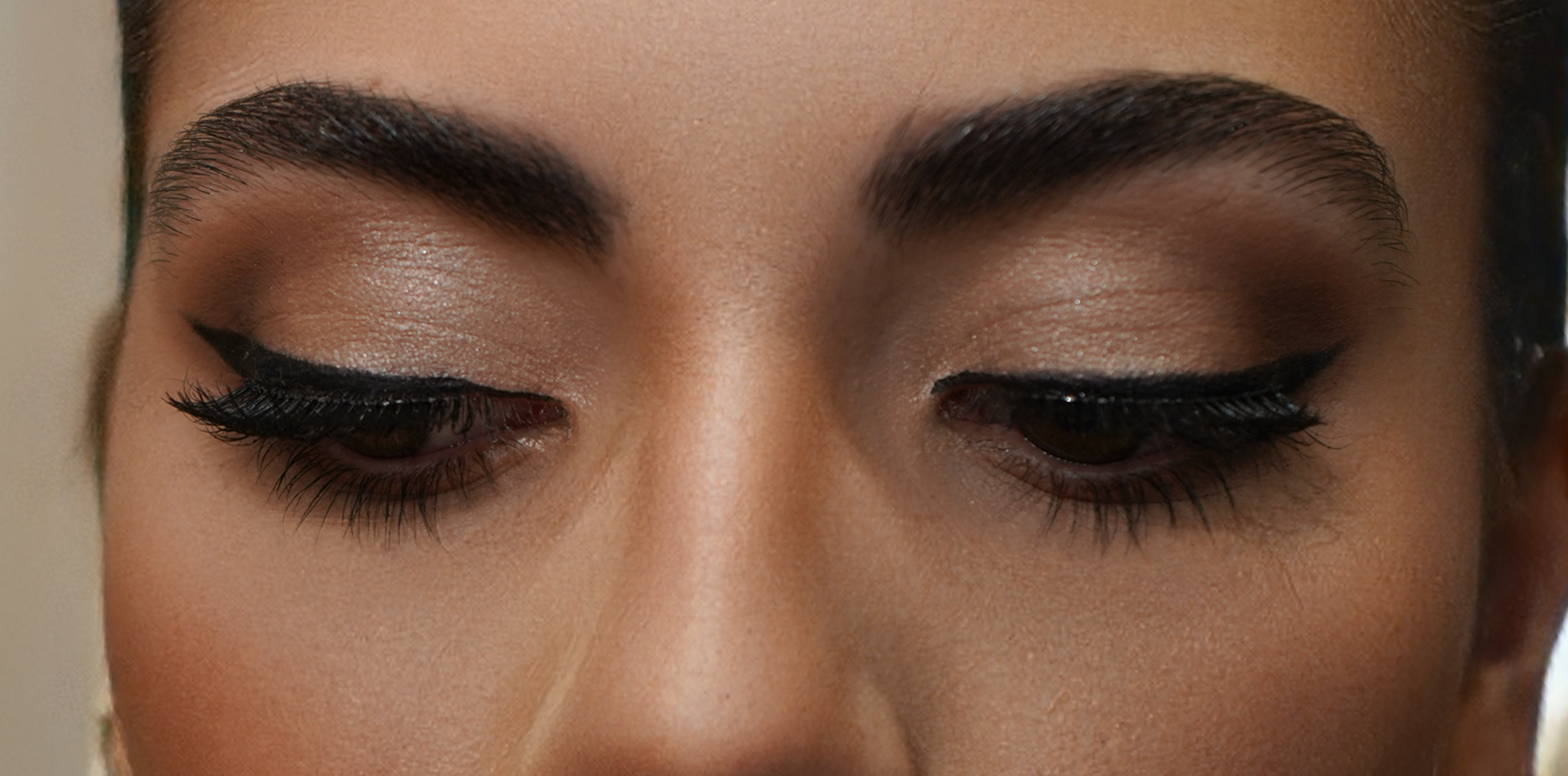 Ojos: Sombras en tonos neutros, delineado marcado tipo cat eye.