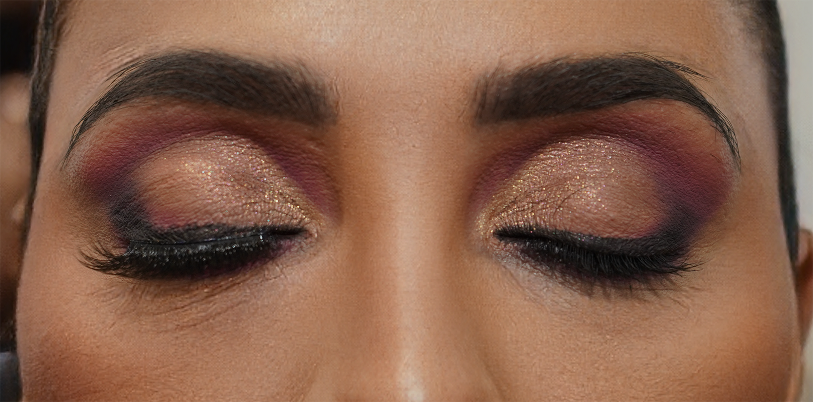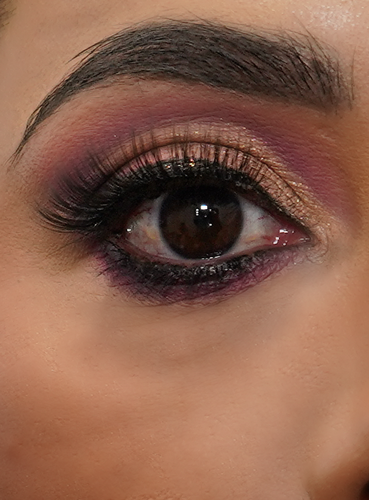 Ojos: Cut crease es una técnica de maquillaje muy especifica en donde se centra la atención del párpado en la cuenca para darle mucha intensidad a la mirada. Puede ser en colores.